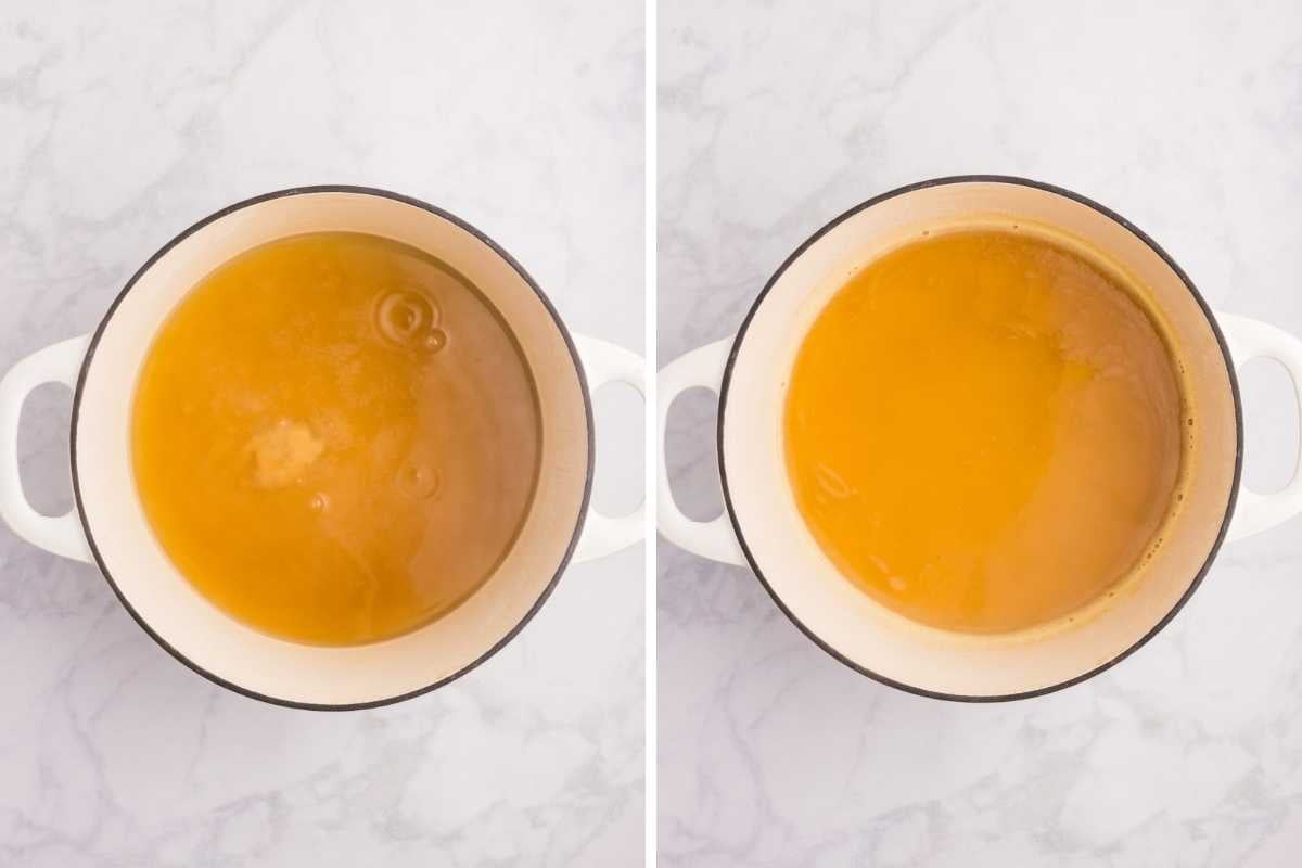 - Skim. Remove from heat and skim off any foam.
