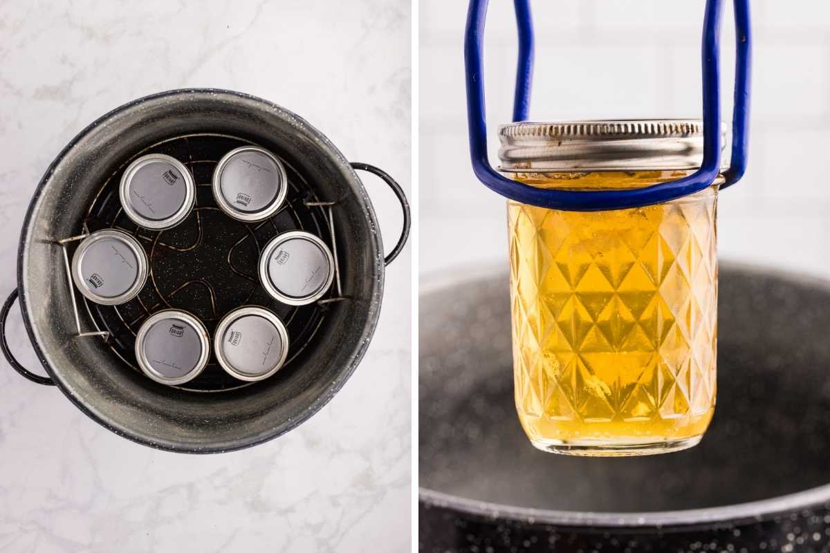 - Process. Place jars in the canner. Make sure the water covers the jars by at least 1 inch. Bring to a full boil and process for 10 minutes, adjusting for altitude as needed. Turn off the heat and let the jars sit in the canner for 5 minutes. Remove jars and let them cool undisturbed for 12 to 24 hours.