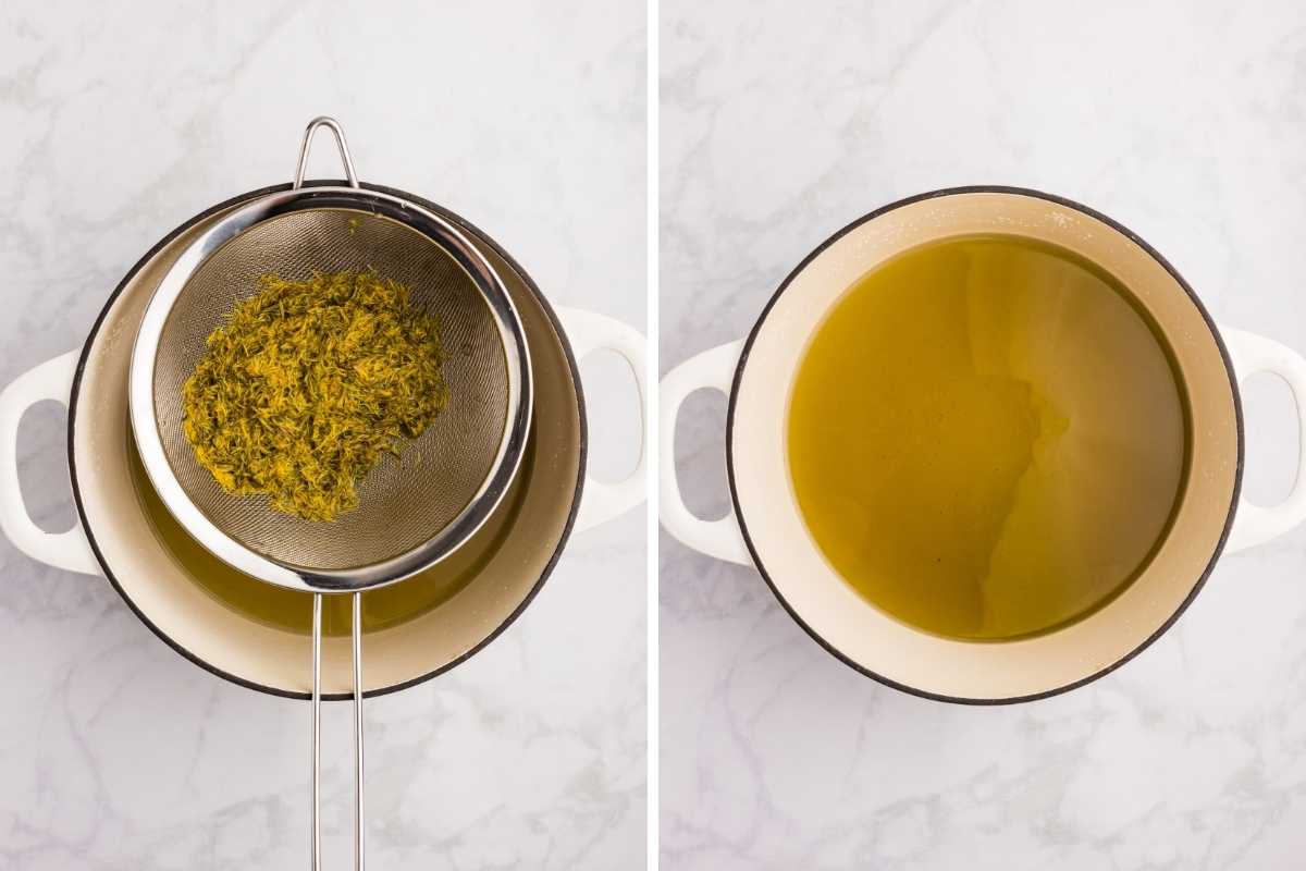 - Strain tea. Strain the dandelion tea through cheesecloth or a fine mesh strainer. Measure 3 cups of dandelion tea into a large pot.