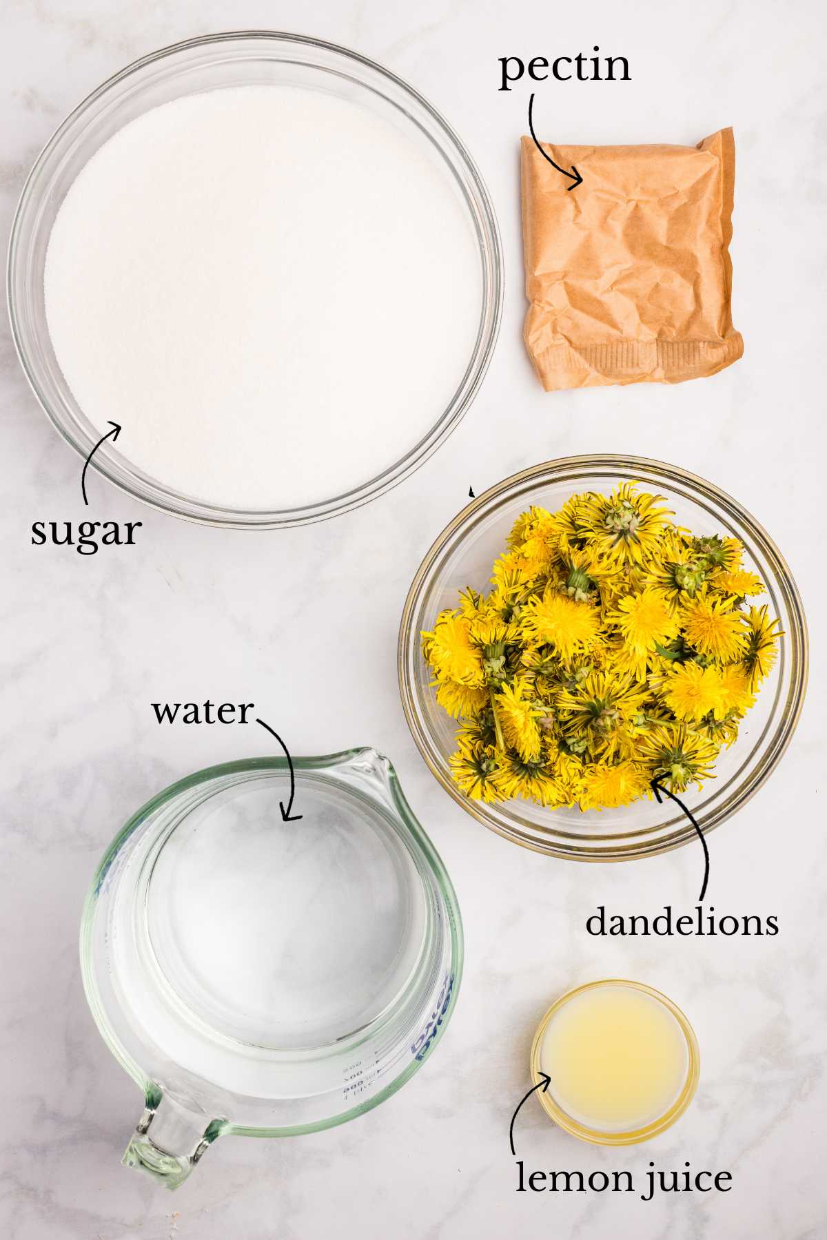 - 4 cups dandelion petals, green parts removed. You’ll need about 5 cups of fresh flowers to get 4 cups of petals after the green parts are removed.
