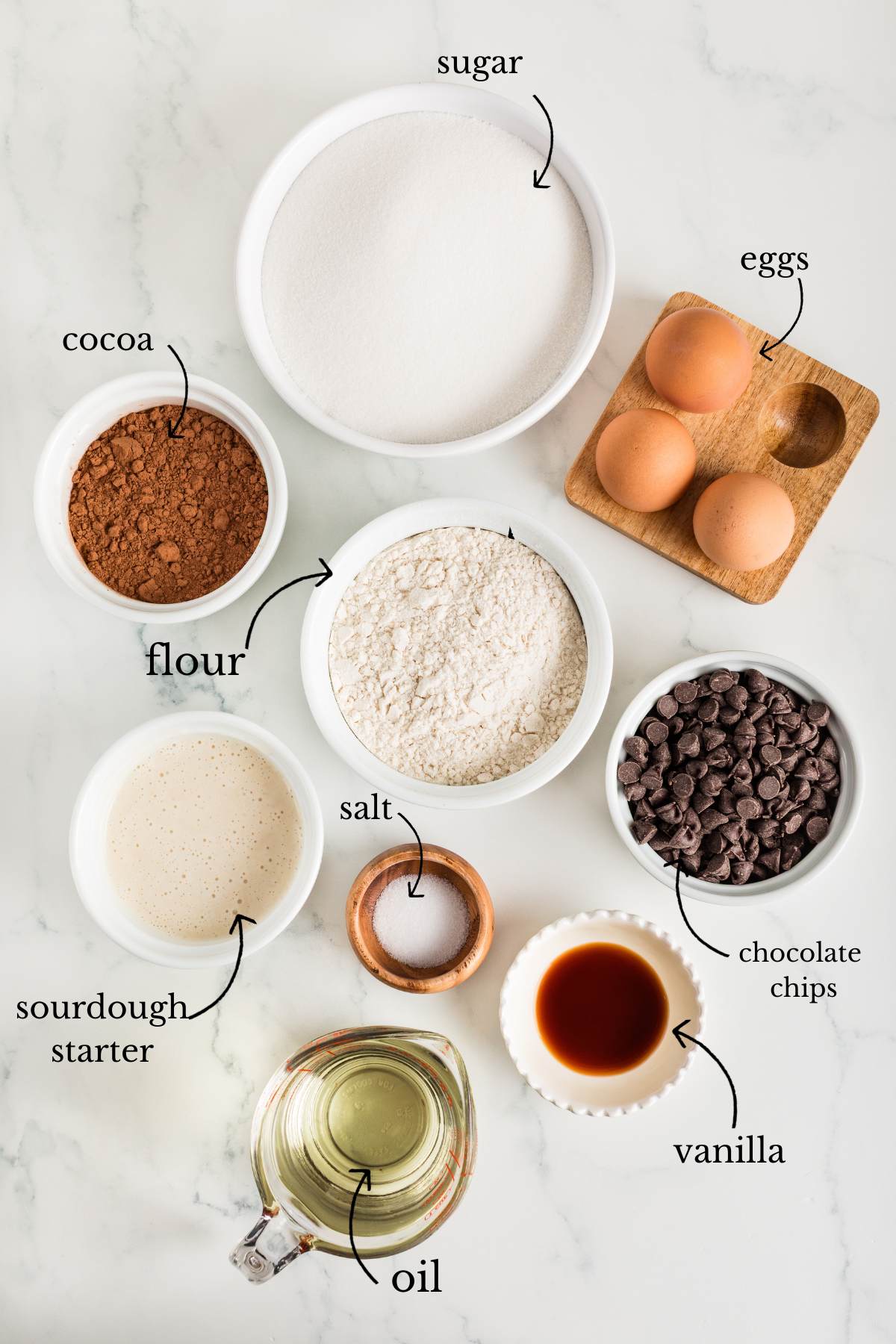- Combine all ingredients. Mix the vegetable oil, cocoa powder, all-purpose flour, granulated sugar, salt, eggs, sourdough starter, and vanilla extract in a large mixing bowl until smooth and shiny. You can use a spatula or a hand mixer. If you're using a mixer, add the chocolate chips last.