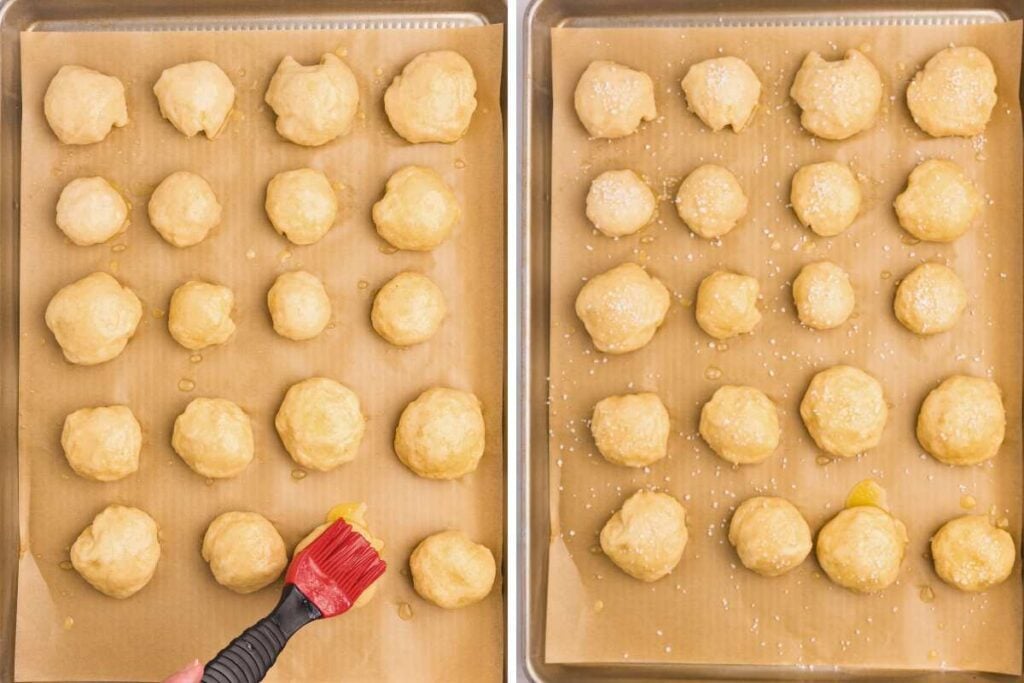 Make sure your oven is completely preheated to 425°F. Brush the tops of your boiled bites with the remaining 2 tablespoons of melted butter (remelt it quickly if it solidified) and sprinkle on your favorite coarse salt.