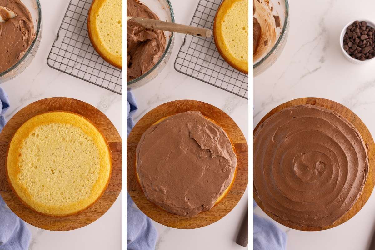 Place one cake round on a serving plate. Spread about 1 ½ cups of frosting evenly over the top.